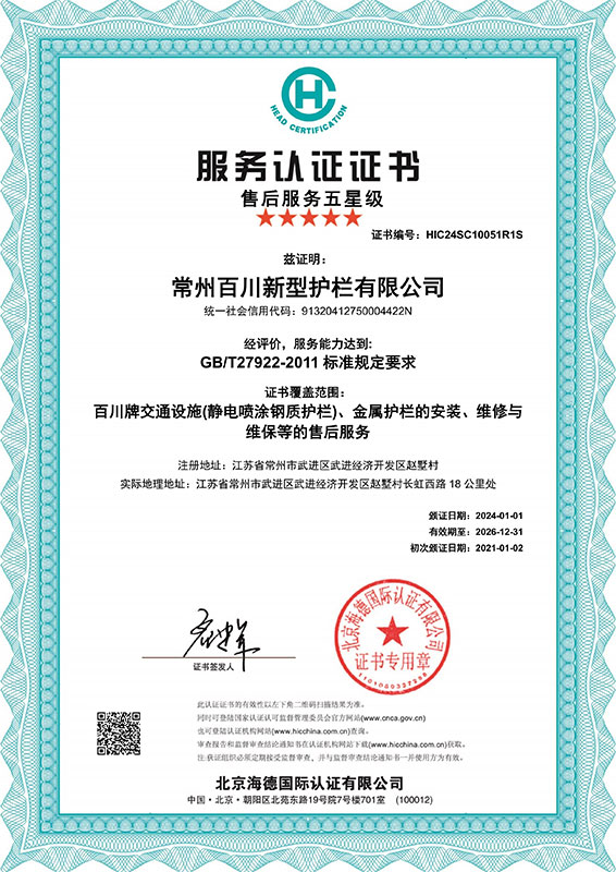 道路護(hù)欄近千萬米、市政輔助設(shè)施近千萬件。公司先后通過了ISO9001質(zhì)量管理體系認(rèn)證、ISO14001環(huán)境管理體系認(rèn)證、ISO45001職業(yè)健康安全管理體系等相關(guān)認(rèn)證。并獲得“質(zhì)量、服務(wù)、信譽(yù)AAA級企業(yè)”、“江蘇質(zhì)量誠信AAA級品牌企業(yè)”、“江蘇省著名品牌”、“江蘇省著名品牌”、“高新技術(shù)企業(yè)”等稱號。